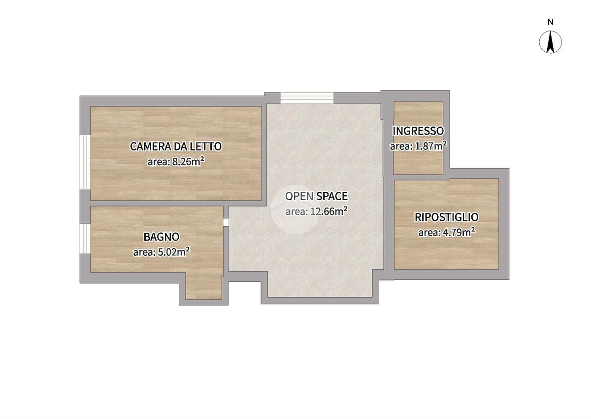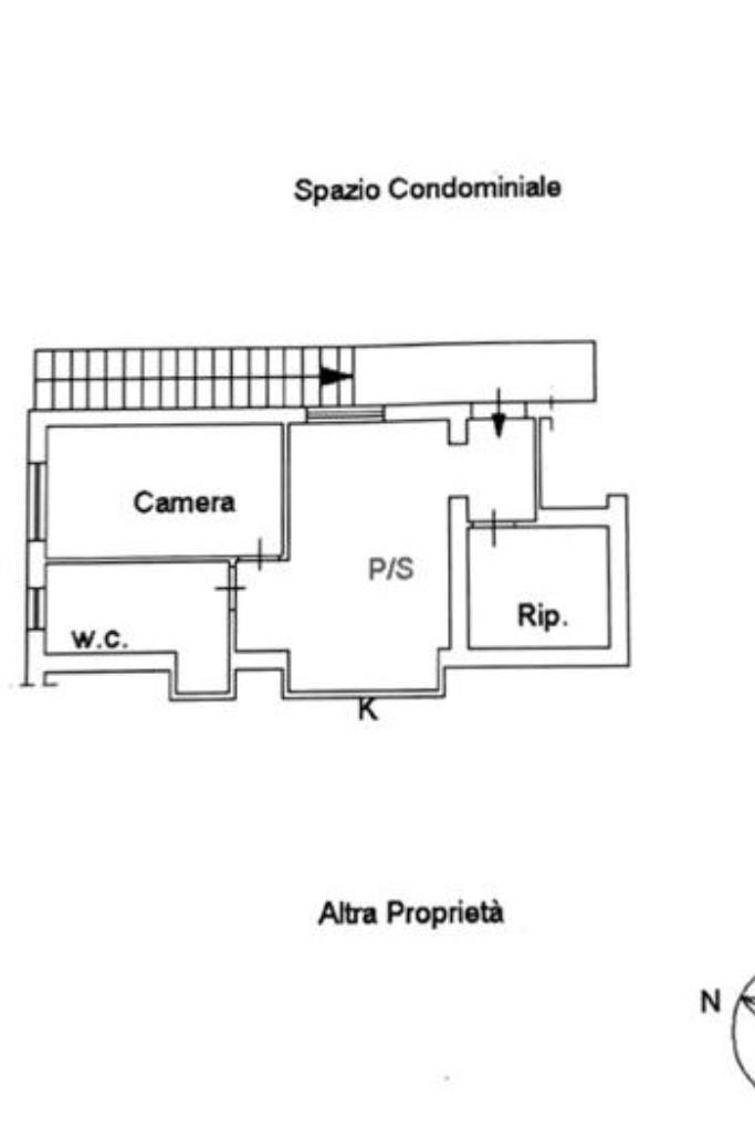La soluzione è suddivisa in: ingresso, open space ( soggiorno con angolo cottura ), una camera da letto, un bagno finestrato con vasca ed un ripostiglio.