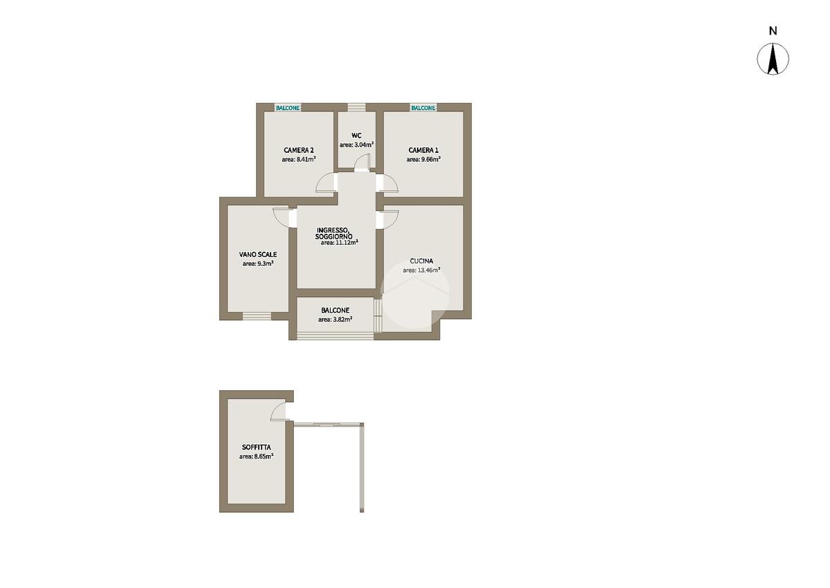 L' immobile è suddiviso in: ingresso, soggiorno, cucina abitabile, disimpegno, due comode camere da letto, due bagni e tre balconi.