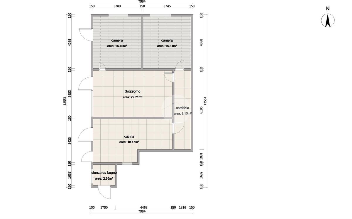 L' appartamento è suddiviso in: ingresso, cucina, soggiorno, corridoio, due camere da letto ed un balcone.