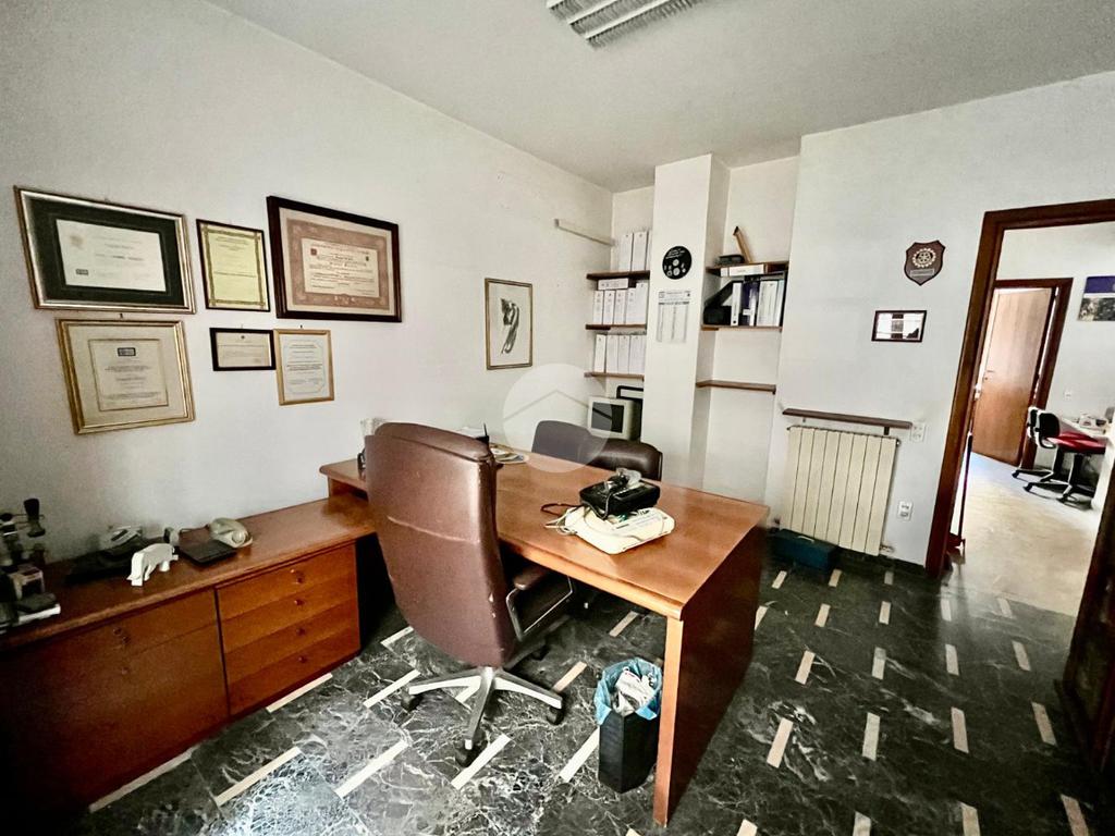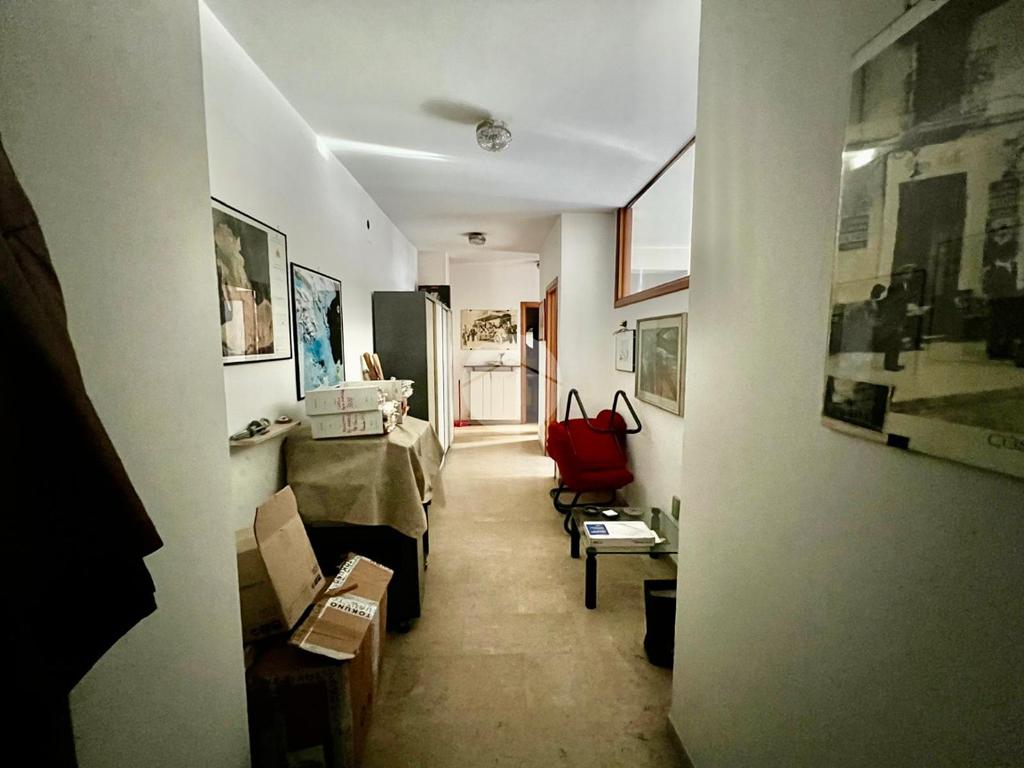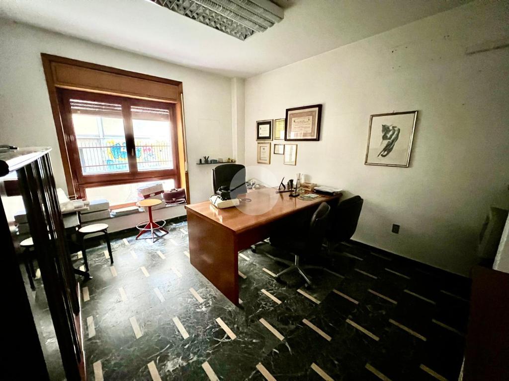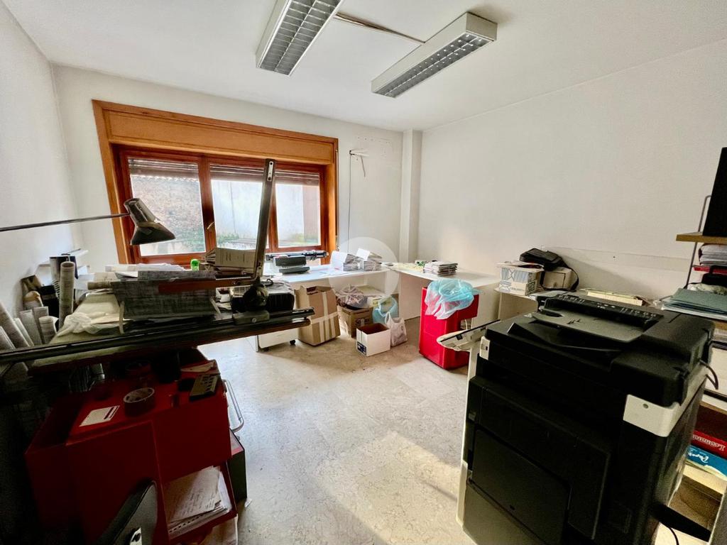 L' appartamento al momento, adibito ad uso ufficio, è suddiviso in: ingresso, corridoio, tre stanze, bagno e ripostiglio.